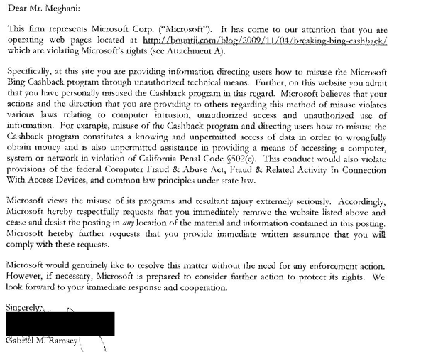 Plutôt que de corriger les failles, et de l’annoncer publiquement, la firme de Redmond a envoyé à Samir Meghani une lettre qui le menace d’un procès en bonne et due forme s’il ne retire pas son billet. Elle reproche non seulement à Meghani d’avoir « fourni des informations qui instruisent des utilisateurs sur la manière de détourner l’utilisation du programme Microsoft Bing Cashback à travers des moyens techniques non autorisés« , mais aussi d’avoir lui-même utilisé ces méthodes à des fins de démonstration. Meghani avait en effet démontré qu’il avait pu collecter plus de 2.000 dollars sur son compte Cashback sans passer la moindre commande. Il se serait ainsi rendu coupable selon Microsoft d’intrusion frauduleuse sur un système informatique, de complicité par fourniture de moyens, et d’escroquerie.