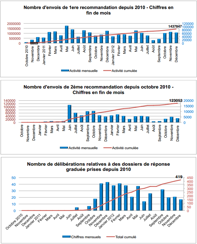 Sur la totalité de l'année 2012, la Hadopi a envoyé :
