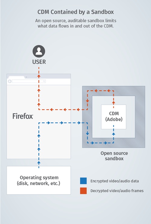 Maintenant que Mozilla a acté l'existence des extensions de médias chiffrés, il reste à déterminer la façon dont ce DRM sera géré par Firefox. Selon la fondation, il n'est pas question d'écrire la moindre ligne de code propriétaire ni d'élaborer un quelconque module destiné à lire les médias encadrés par un EME. C'est l'entreprise Adobe qui va s'en charger, via une sandbox open source.