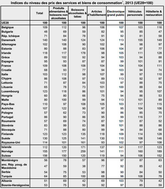 L'institut public Eurostat a publié vendredi une étude sur les niveaux des prix à la consommation en Europe, qui montre de très fortes disparité du coût de la vie entre les états membres. Sur une base où la moyenne des prix est à l'indice 100, le Danemark est le pays où les produits et services coûtent le plus cher (140 %), alors que c'est Bulgarie que le pouvoir d'achat est le plus important à porte-monnaie constant (48 %). La France se situe légèrement au dessus de la moyenne européenne, avec des prix 9 % plus importants que dans l'ensemble des 28 états membres.