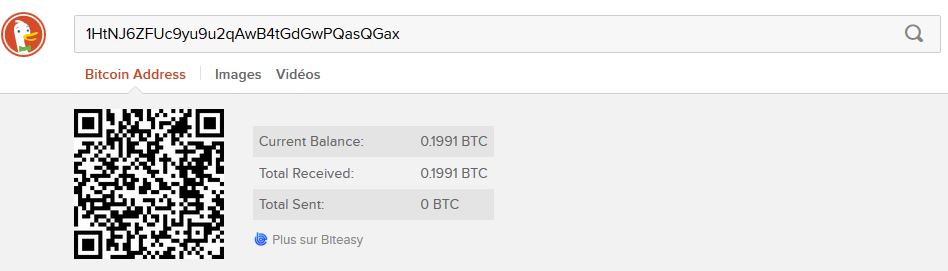 En effet, il est désormais possible d’effectuer des recherches portant sur des adresses ou des transactions impliquant des bitcoins. Il suffit pour cela de taper la chaîne de caractères correspondante dans le champ de saisie. Le moteur de recherche affichera alors un encart en haut des résultats contenant certaines informations (par exemple, dans le cas de l’adresse Bitcoin : état du compte, total reçu, total dépensé).