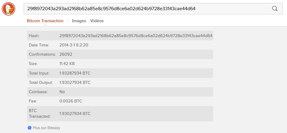 L’intégration de cette fonctionnalité s’est déroulée en partenariat avec BitEasy. Chaque requête peut ensuite être détaillée directement sur le site de BitEasy, qui fournira des données supplémentaires. Dans le cas de l’adresse Bitcoin, les quinze dernières transactions s’afficheront avec leur hash, date, somme versée et montant final.