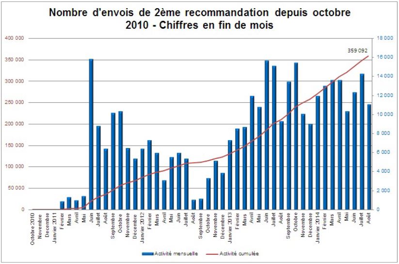 Concernant les avertissements accompagnés d'une lettre recommandée, 14 300 abonnés ont été mis en garde une deuxième fois au mois de juillet. Le mois suivant, ils ont été 11 069 à recevoir une lettre recommandée avec accusé de réception. Au total, plus de 359 000 abonnés ont atteint le deuxième palier de la riposte graduée depuis sa mise en place, en octobre 2010.
