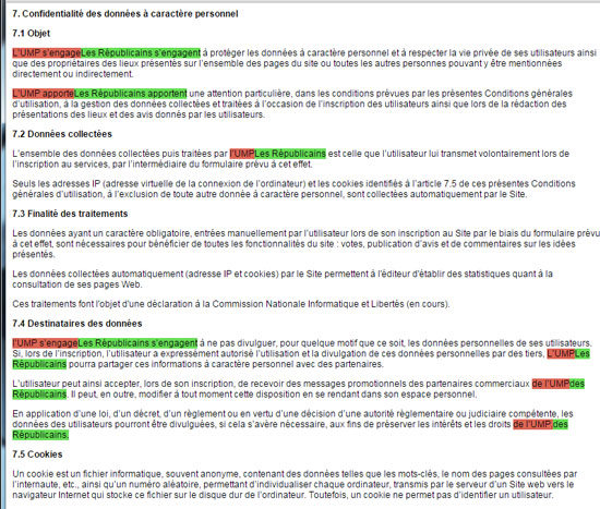 En effet selon nos constatations, les CGU ont évolué cette semaine, pour que "UMP" soit désormais remplacé par "Les Républicains", conformément au changement de nom du parti dirigé par Nicolas Sarkozy. Partout dans le texte, le nom du parti a été modifié, et les verbes accordés en conséquence pour passer au pluriel. Mais c'est strictement la seule modification apportée.