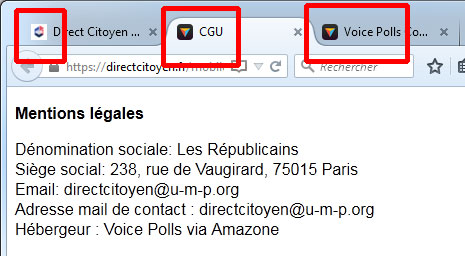 Le flou est dû en grande partie aux conditions contractuelles de Direct Citoyen, particulièrement imprécises, incomplètes et très mal rédigées, faisant davantage penser à un travail amateur qu'à l'emploi d'un cabinet d'avocats zélés. Le favicon de la page des CGU trahit d'ailleurs qu'elles ont été mises en ligne par la société américaine, Voice Polls, dont c'est le logo :