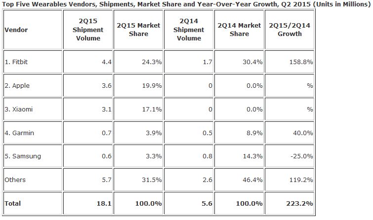 Selon des chiffres communiqués par IDC, Fitbit s'est arrogé pratiquement un quart du marché (24,3 %) au niveau mondial. C'est plus qu'Apple, qui arrive en deuxième position (19,9 %). Suivent ensuite le chinois Xiaomi (17,1 %), l'américain Garmin (3,9 % et le sud-coréen Samsung (3,3 %). Toutes les autres marques pèsent le dernier petit tiers du marché (31,5 %).