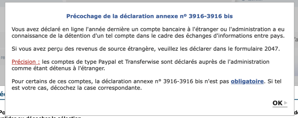 - Une fenêtre « Déclarations annexes » apparait, et il faudra cocher la case qui correspond au formulaire N°3916-3916 bis, « Déclaration par un résident d’un compte ouvert, détenu, utilisé ou clos à l’étranger ».