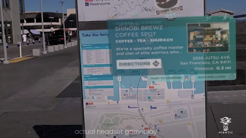 Grâce à elle, Niantic a pu concevoir des lunettes au look d’un masque de ski. On voit au travers la réalité… et des hologrammes. On peut bien entendu jouer à Pokémon Go dans le monde réel (avec des Pokémon au milieu du trottoir, mais sans smartphone), mais aussi se divertir avec d’autres types de jeux (du combat au pistolet par exemple) ou trouver des informations de navigation. Niantic donne l’exemple d’un panneau virtuel pour savoir où l’on se trouve.