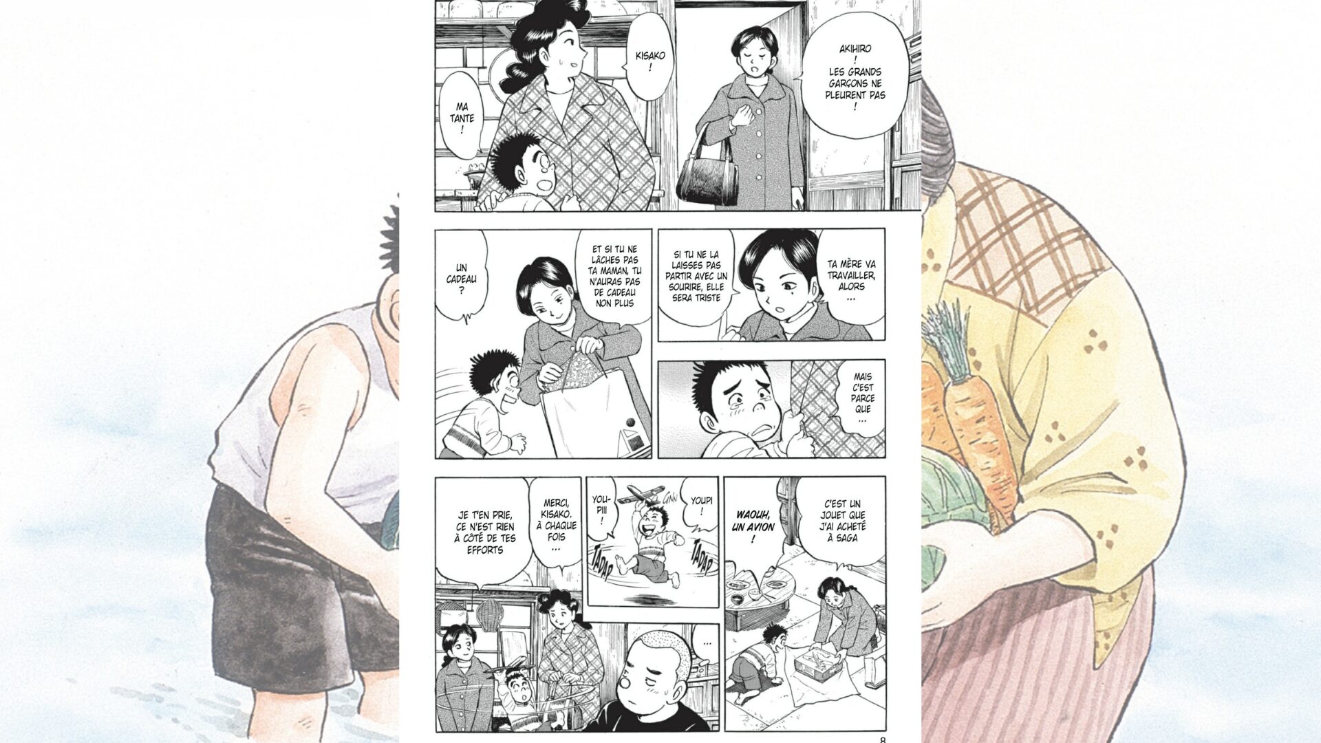 Une sacrée mamie, adapté de l’autobiographie de Yoshichi Shimada et illustré par Saburō Ishikawa, nous transporte à Hiroshima en 1957, où Akihiro, un jeune garçon turbulent, est confié à sa grand-mère dans la campagne modeste de Saga. Entre pauvreté et découverte d’un quotidien rural, le récit suit avec justesse et humour les aventures du garçon. Ce manga est publié initialement en 11 volumes chez Delcourt/Tonkam, et depuis 2022 d’une édition double en 5 tomes.