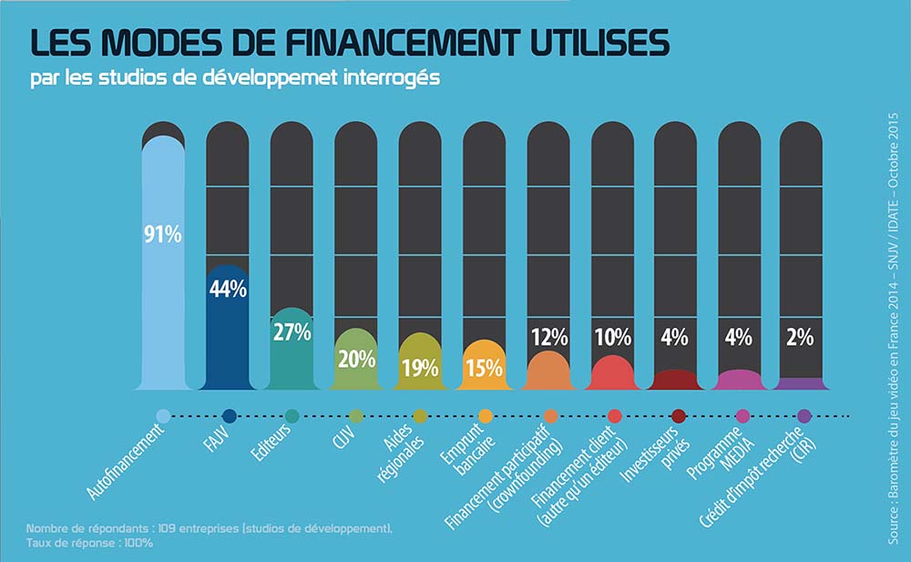 Selon les résultats du baromètre 2015 du jeu vidéo, la quasi-totalité des 109 studios de développement opte pour l’autofinancement (91 %) pour trouver des fonds. Le deuxième moyen le plus utilisé arrive assez loin derrière : il s’agit du fonds d’aide au jeu vidéo (44 %). Les éditeurs arrivent en troisième position (27 %). Quant aux huit autres solutions, elles ne dépassent pas la barre des 20 %.
