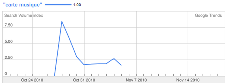 Les données d’Alexa sont loin d’être fiables, surtout pour un site qui génère extrêmement peu de trafic au niveau mondial. Mais la tendance est confirmée par Google Trends, qui mesure la popularité de l’expression « Carte Musique » dans le moteur de recherche :