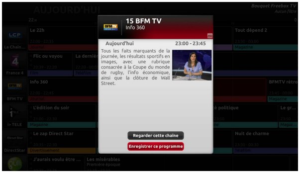 Enfin, Free a décidé de répondre à l’une des critiques les plus vives depuis l’arrivée de la Freebox V6 dans les foyers en ramenant le Guide des Programmes à la vie. En effet, depuis janvier, cette fonctionnalité qui permettait d’avoir un aperçu du programme télé sur sa Freebox HD (V5) avait disparu. Il revient doté d’une nouvelle interface qui se marie mieux avec l’ensemble des menus de la Freebox Revolution.
