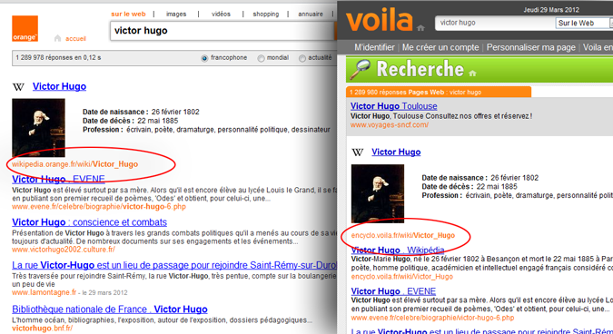 Mais Orange va beaucoup plus loin et, selon nous, franchit la ligne rouge. Non seulement l’opérateur copie Wikipédia, mais en plus il impose à ses moteurs de recherche de remplacer les résultats devant mener au site officiel de Wikipédia par son propre miroir. Ainsi, une recherche sur Orange.fr (ou la barre d’outils d’Orange) conduit vers le miroir de Wikipédia par Orange, tandis qu’une recherche sur Voila conduit vers le miroir de Wikipédia par Voilà :