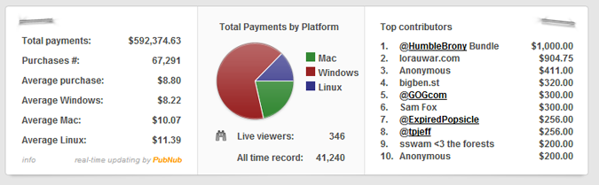 De façon beaucoup plus institutionnalisée, les Humble Bundle qui permettent de télécharger des jeux vidéo à prix libre rencontrent un énorme succès à chaque édition. Le premier avait rapporté plus d’un million de dollars aux studios indépendants. Or il est amusant de voir que le modèle de Humble Bundle reprend les « ficelles » données par l’étude. Ainsi, le prix moyen donné par les clients est communiqué pour déculpabiliser ceux qui ne souhaitent pas donner plus, et il est indiqué qu’une partie du prix est reversée à une association :