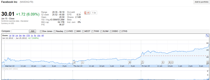 La lente descente aux enfers de Facebook sur les marchés boursiers semble avoir pris fin. L’action du réseau social a repris des couleurs ces derniers jours, se permettant même de repasser au-dessus de la barre des 30 dollars (30,01 dollars très exactement). Il y a pourtant encore quelques jours, rien ne semblait freiner la chute de la valeur du titre. À son plus bas niveau, Facebook valait 25,52 dollars par action.