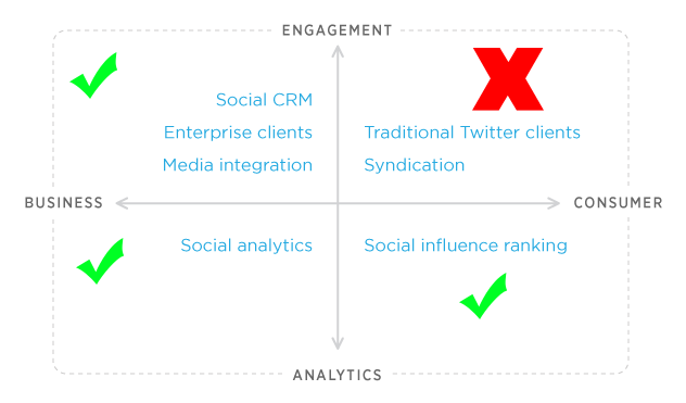 Twitter assume totalement ses nouvelles directions, déjà annoncées il y a plus d'un an, et propose même un graphique à quatre cases qui résume sa philosophie. "Nous essayons d'encourager l'activité dans les cases en haut à gauche, en bas à gauche, et en bas à droite, et de limiter certaines utilisations qui occupent la case en haut à droite", explique le réseau social. Twitter cite explicitement TweetBot ou Echofon comme des applications visées par ses nouvelles règles.