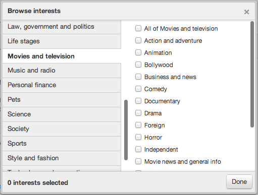 Avec ce mécanisme, les annonceurs sélectionneront les centres d'intérêt correspondant à leur publicité. Dans la catégorie "films et télévision", il sera par exemple possible de cocher un ou plusieurs genres (action, animation, comédie, documentaire, drame, indépendant…). Un studio de cinéma pourra ainsi faire la promotion d'un film en ciblant son public potentiel.