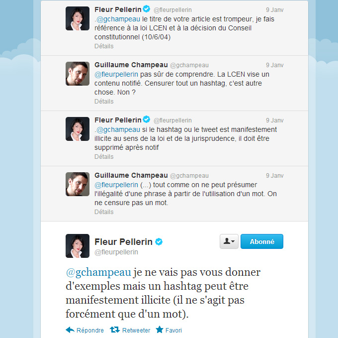 Dans un premier temps, Fleur Pellerin avait paru s'en tenir à notre interprétation de ses propos. Interrogée via Twitter, la ministre de l'économie numérique nous avait certes reproché "un titre trompeur", mais confirmé que selon elle, "un hashtag peut être manifestement illicite".