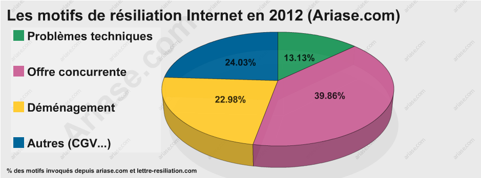 Néanmoins, Ariase publie depuis 2007 un observatoire des résiliations afin de connaître les principales raisons avancées par les internautes. Deux grands motifs se détachent cette année : l'offre concurrente et les problèmes de connexion. Sur la majorité des FAI étudiés, l'offre concurrente et les problèmes de connexion constituent plus de la moitié des causes.