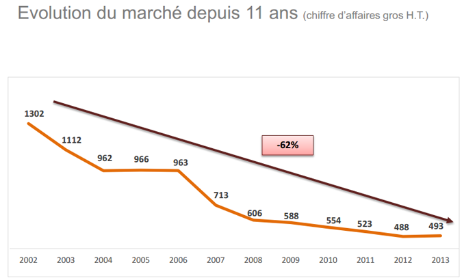 L'an dernier, le marché de gros hors-taxe a représenté au total 603,2 millions d'euros, en légère hausse de 2,3 % par rapport à 2012, qui avait signé un recul important. Mais si le montant global du chèque signé aux maisons de disque augmente pour la première fois depuis plus d'une décennie (il reste toutefois très bas, cf graphique ci-dessous), c'est uniquement grâce à l'augmentation des barèmes des droits voisins, c'est-à-dire des licences d'exploitation payées par les radios, les télévisions, les petits commerces qui diffusent de la musique pour leurs clients, ou les discothèques.