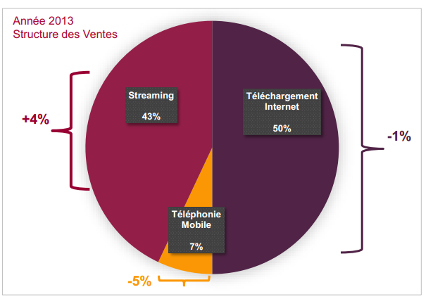 Dans le détail, le marché numérique se compose pour 43 % du streaming ( 4 % seulement) et de 50 % pour les téléchargements sur iTunes et autres plateformes de MP3 à télécharger.