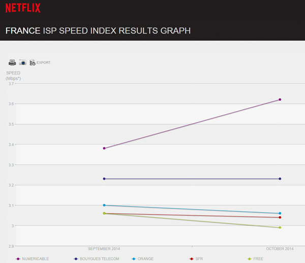 Déjà en tête le mois dernier grâce à ses technologies d'accès à très haut débit, Numericable passe en un mois de 3,38 Mbps délivrés vers Netflix à 3,62 Mbps. Le premier opérateur à suivre est Bouygues Telecom, qui reste à  3,12 Mbps, légèrement devant les trois derniers. De façon anecdotique, Free est désormais le plus lent des gros FAI français avec un débit mesuré à 2,99 Mbps, alors que SFR a réussi à stabiliser au niveau de 3,04 Mbps.