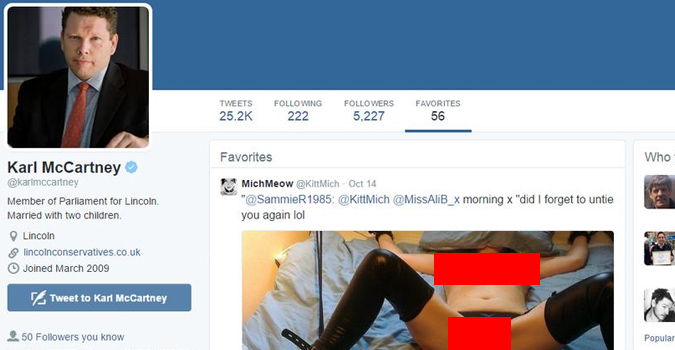 En attendant, c'est en Grande-Bretagne que l'excuse du compte Twitter piraté a été sortie par un élu. Le député conservateur Karl McCartney avait mis en favori une photographie pornographique publiée par un internaute, qui montrait une femme allongée et attachée dans un lit, dans une position des plus accueillantes. Sans doute faisait-il partie de ces nombreux internautes qui ne savaient pas que les favoris sont publics sur Twitter. Or c'est une adversaire politique du parti travailliste, Lucy Rigby, qui a découvert la chose l'a publiée au grand jour, pour mettre le député dans l'embarras.