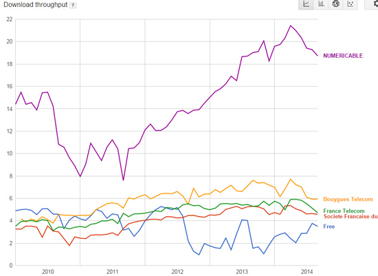 Selon les chiffres du M-Lab (qui sont relativement cohérents avec ceux de Netflix), Free affiche un débit descendant (téléchargement) moyen de 3,5 Mbps, alors que ses concurrents directs sont entre 4,5 et 6 Mbps. Les performances de l’opérateur se sont effondrées mi-2012, et présentent depuis un comportement erratique. Il semble toutefois revenir sur la bonne voie en 2014 pour retrouver bientôt un niveau équivalent à SFR, Bougyues et Orange, qui ont au contraire cessé toute progression, voire régressé ces derniers mois :