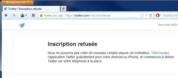 Nos propres tests n'ont cependant pas confirmé la mise en place de la mesure sur la version française de Twitter, le réseau social ayant plus brutalement encore refusé notre inscription réalisée à partir d'une connexion sécurisée par Tor. "Nous ne pouvons pas créer de nouveau compte depuis cet ordinateur", dit un message sibyllin qui conseille de passer "à la place" par les applications pour téléphone mobile :