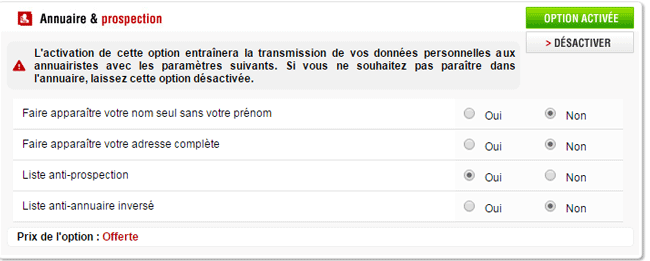 Vérification faite, voici les réglages qui figuraient dans notre console de gestion ("Mon compte" > "Mes Options" > "Annuaire et Prospection"). Comme vous pouvez le voir, l'option est bien marquée "activée". Free prévient que "l'activation de cette option entraînera la transmission de vos données personnelles aux annuairistes avec les paramètres suivants. Si vous ne souhaitez pas paraître dans l'annuaire, laissez cette option désactivée."