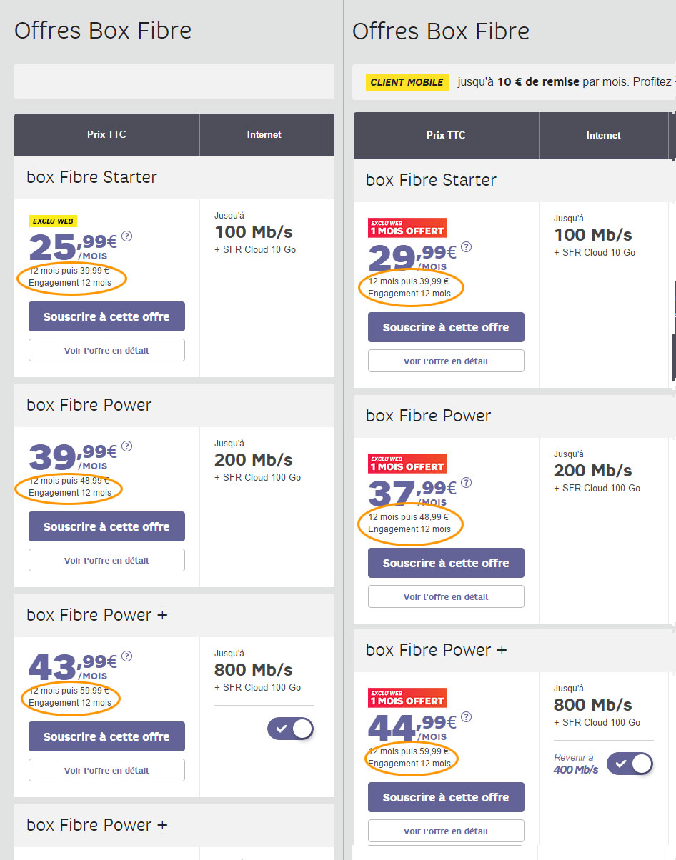 S'il y a augmentation des tarifs, c'est donc uniquement la première année. Le forfait de base augmente ainsi de 4 euros (il passe à 29,99 euros pendant 12 mois), soit 48 euros d'augmentation par abonné, quelle que soit la durée finale de l'abonnement. Le forfait le plus cher pour 800 Mb/s passe quant à lui à 44,99 euros par mois (+ 1 euro par mois), ce qui fait un surcoût de 12 euros la première année.