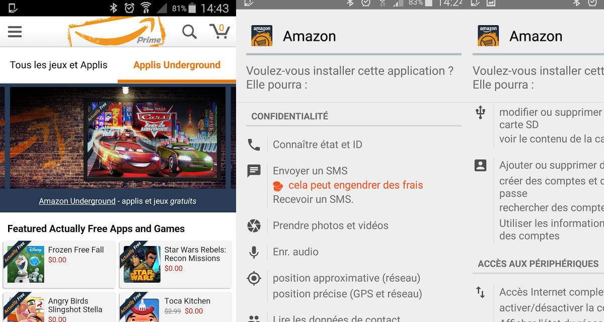 Un élément de réponse pourrait se trouver dans les autorisations que s'octroie Amazon Underground. Comme le remarque ZDNet, la liste des droits à accorder pour utiliser l'application est impressionnante. Elle comprend notamment l'envoi de SMS et la lecture des SMS reçus, l'accès au contenu de la carte SD, à la géolocalisation de l'utilisateur, à la caméra, aux paramètres Wi-Fi, etc. Mais aussi l'accès aux contacts de l'utilisateur.