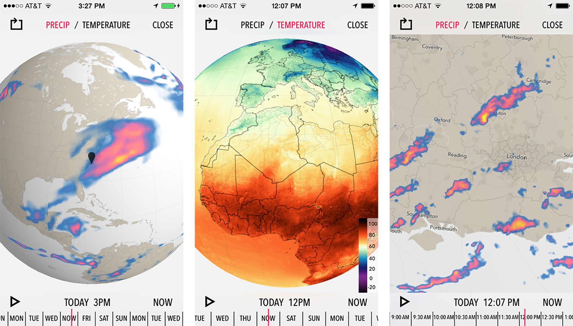 Dark Sky propose une visualisation du globe avec les précipitations et les températures.