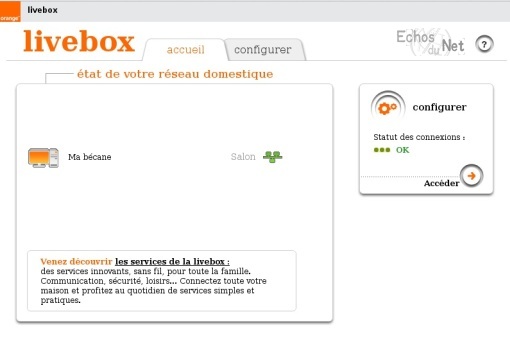 « Premier constat, la Livebox Mini possède 6 diodes au lieu de 5 : un voyant permet de vérifier si la Livebox est allumée ou non. On retrouve les diodes présentes sur les anciens modems, mais dans un ordre différent et une nouvelle signalétique : Internet (@), Téléphonie (téléphone), Activité Réseau (symbole d’un réseau de 3 ordinateurs), WiFi ( ((i)) ) et d’alerte (->D). Les boutons 1 et 2 de la Livebox Thomson/Inventel ont disparu de l’arrière pour se retrouver avec les ports Ethernet et le port USB. Le bouton REG de la Livebox Sagem devient plus visible. «