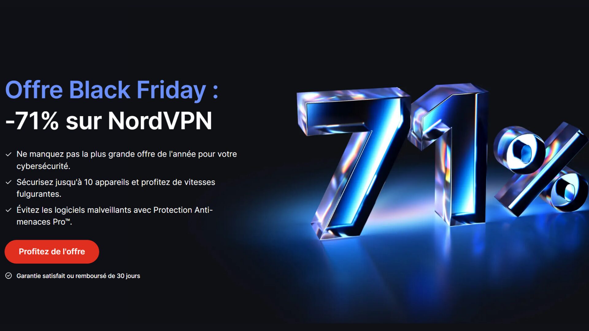 NordVPN propose différentes réductions sur ses abonnements pour le Black Friday, avec trois mois d’abonnement offerts pour toute souscription. L’abonnement Basique de deux ans est proposé au prix de 2,99 € par mois, ou 80,73 € pour les deux premières années, au lieu de 312,93 €.