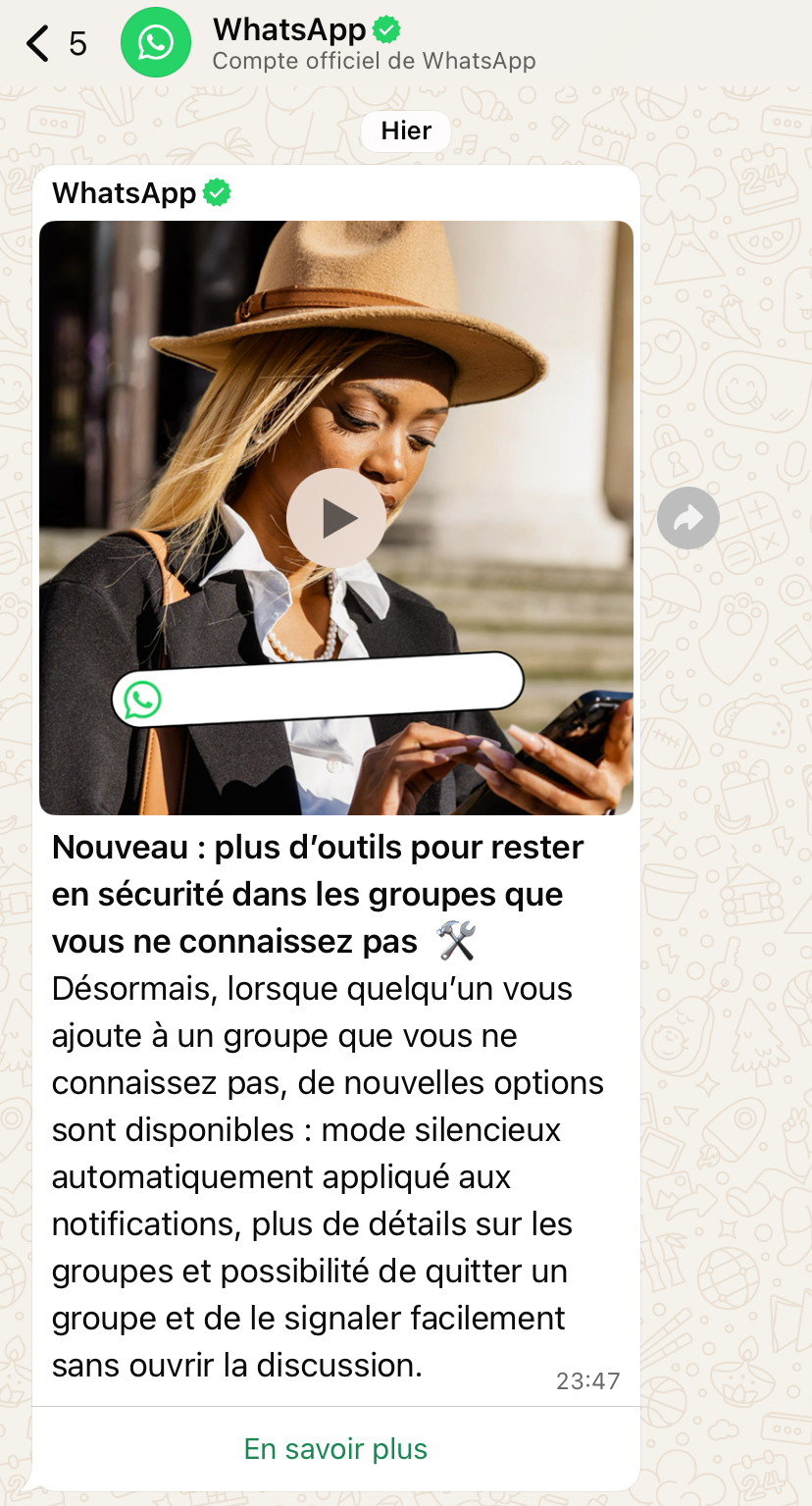 Désormais, lorsque la personne qui vous ajoute ne fait pas partie de vos contacts, la plateforme affiche d’abord un aperçu de sécurité, qui présente des informations essentielles comme le nom du groupe ou les membres principaux, et partage quelques réflexes de vigilance pour éviter les pièges.