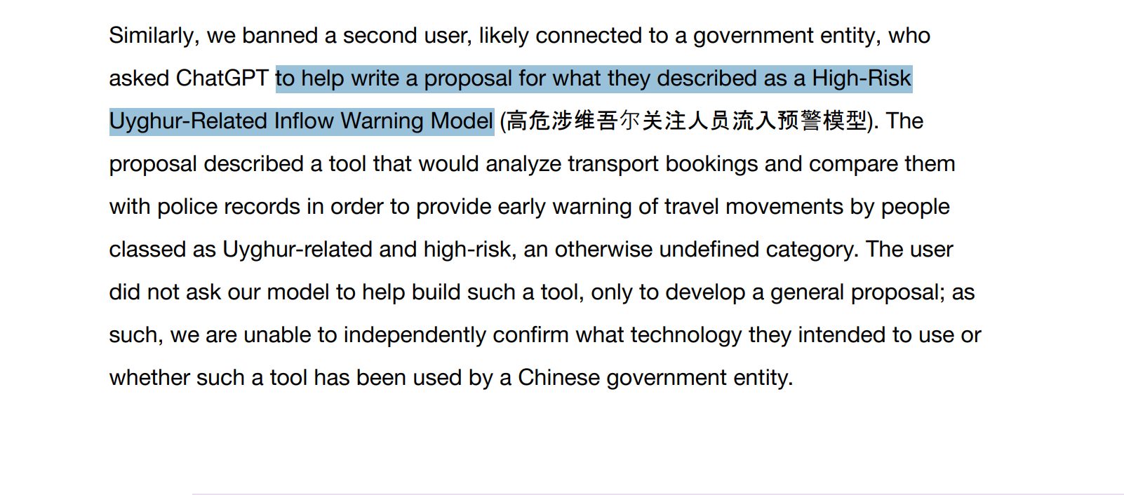 Ce n’est pas une rumeur, mais bien le résultat du rapport publié le 7 octobre 2025 par OpenAI, le créateur de ChatGPT. Intitulé « Disrupting malicious uses of AI: October 2025 », celui-ci révèle que des utilisateurs « soupçonnés d’être affiliés au gouvernement chinois» ont sollicité ChatGPT pour développer « des propositions de projets et du matériel promotionnel relatifs à des outils de surveillance de masse ». L’un d’entre eux a par exemple demandé de l’aide au chatbot afin d’imaginer un outil capable de repérer les déplacements liés aux Ouïghours et autres personnes « à risque », en recoupant fichiers de police et réservations de transport. Rien que ça.