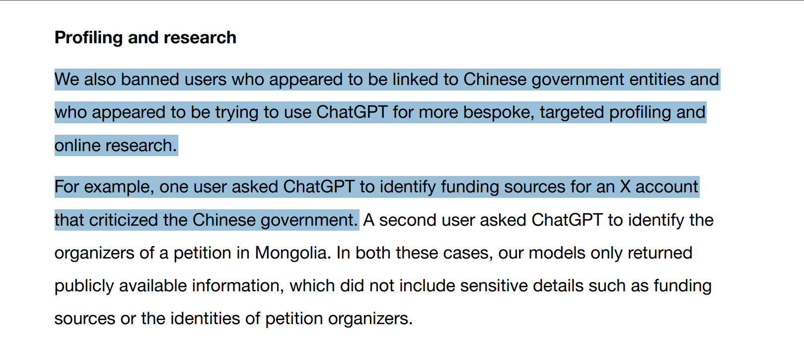 Au-delà de la conception d’outils aux intentions obscures, certains comptes auraient utilisé ChatGPT pour du profilage ciblé ou des recherches très (un peu trop) spécifiques. L’un aurait, par exemple, demandé d’identifier les sources de financement d’un compte X critique envers le gouvernement chinois – un autre, de retrouver les organisateurs d’une pétition en Mongolie.