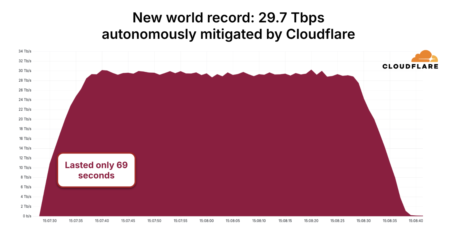 Le graphique présenté par Cloudflare est édifiant. L’attaque n’a duré que 69 secondes, mais son pic à 29,7 Tbit/s a dépassé le précédent record, établi à 22,2 Tbit/s. À l’époque, le trafic généré par cette offensive était comparé au streaming simultané d’un million de vidéos en ultra haute définition (4K).