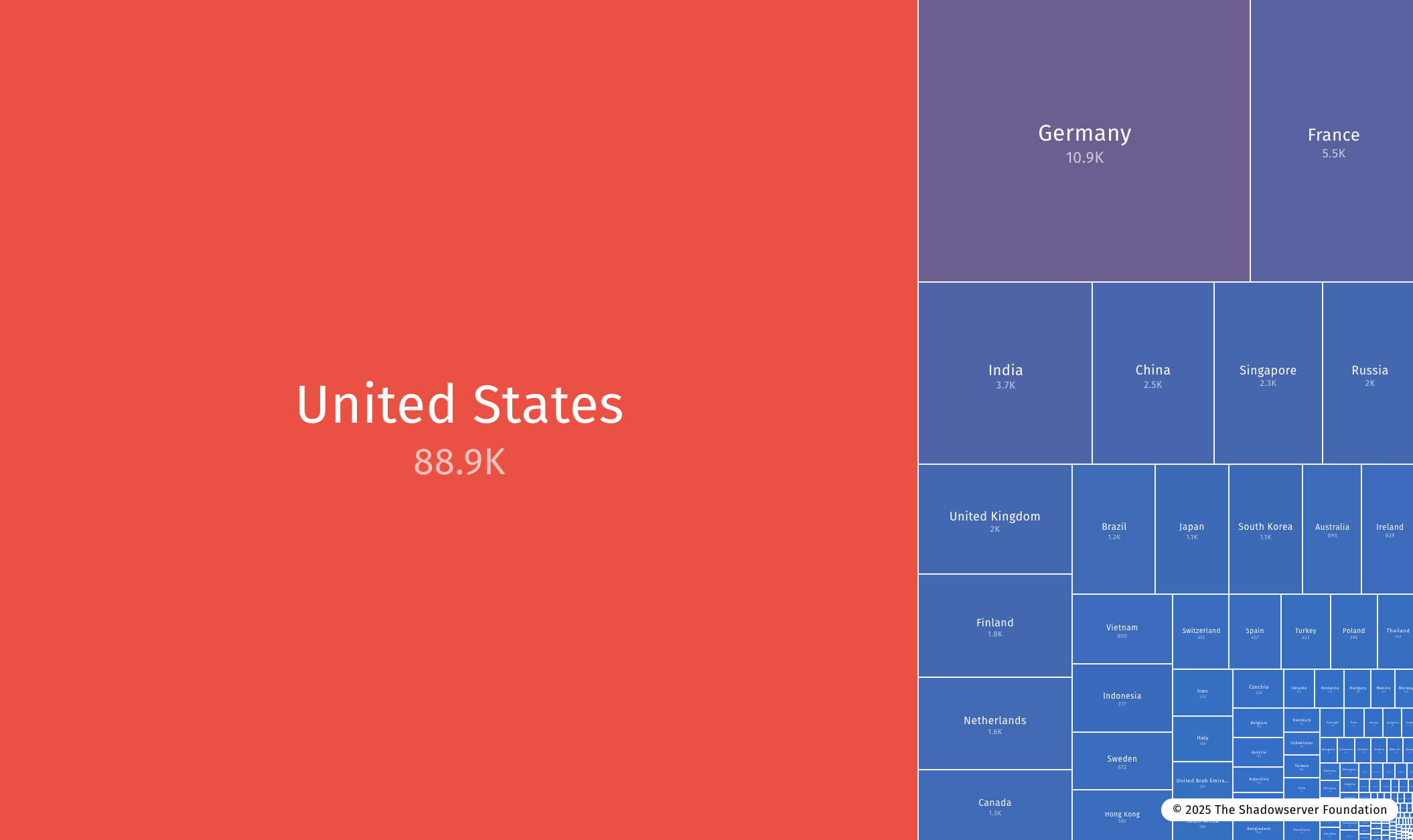 Autre élément marquant : la France est loin d’être épargnée. Elle apparaît comme le troisième pays le plus touché, avec environ 5 500 adresses IP toujours vulnérables, juste derrière les États‑Unis (près de 88 900) et l’Allemagne (10 900).