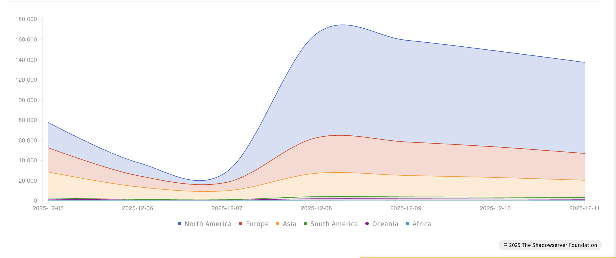 Selon les dernières données de la Shadowserver Foundation, plus de 137 200 adresses IP exposées sur Internet exécutent encore du code vulnérable; si un pic semble avoir été passé entre les 8 et 9 décembre, les chiffres restent largement préoccupants.