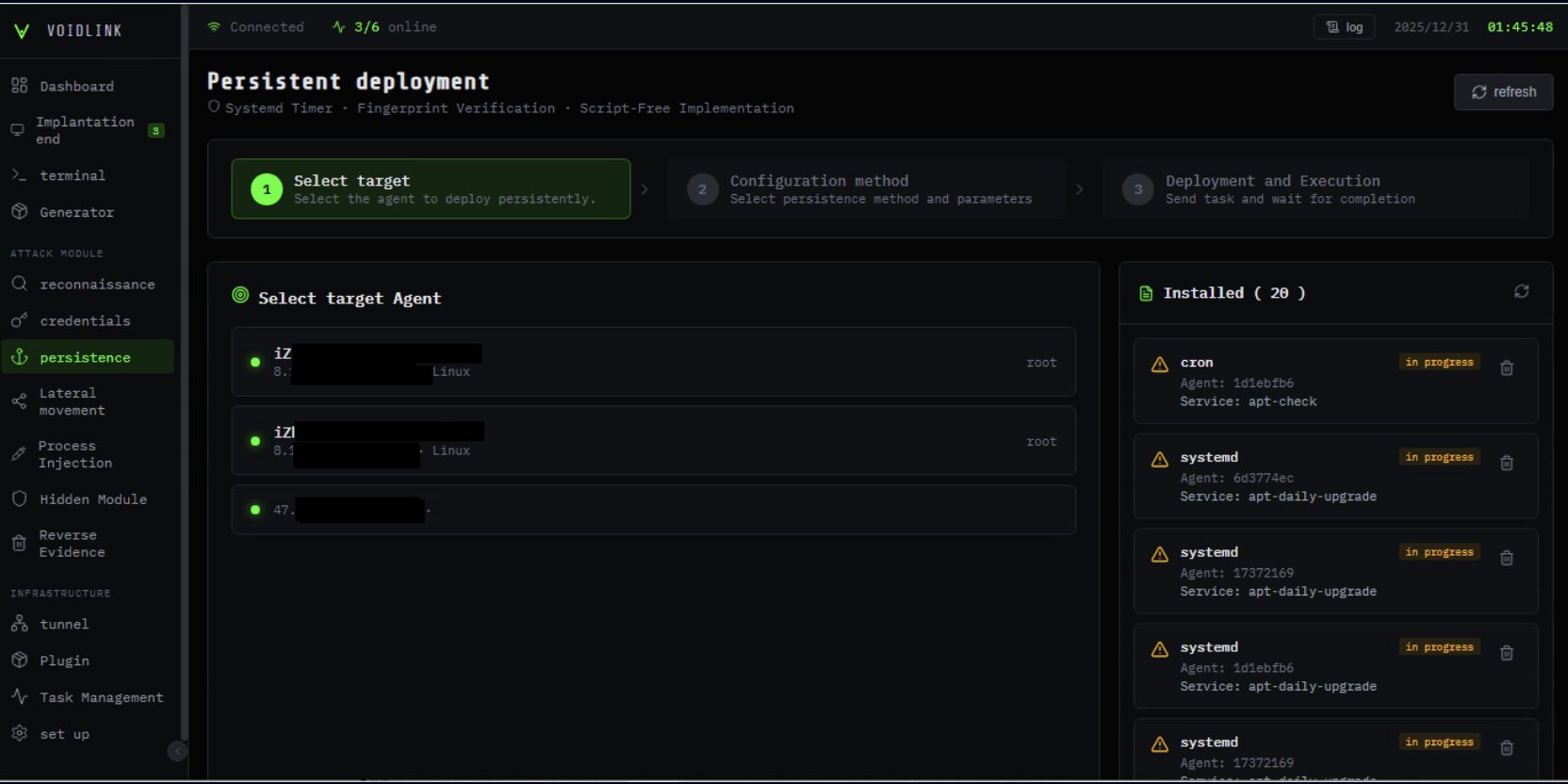 VoidLink embarque un arsenal de techniques pour se cacher, durer et garder le contrôle de la machine compromise, en s’appuyant notamment sur des mécanismes de type rootkit pour dissimuler ses processus, et sur plusieurs canaux de commande et contrôle pour rester en contact avec ses opérateurs tout en brouillant les pistes.