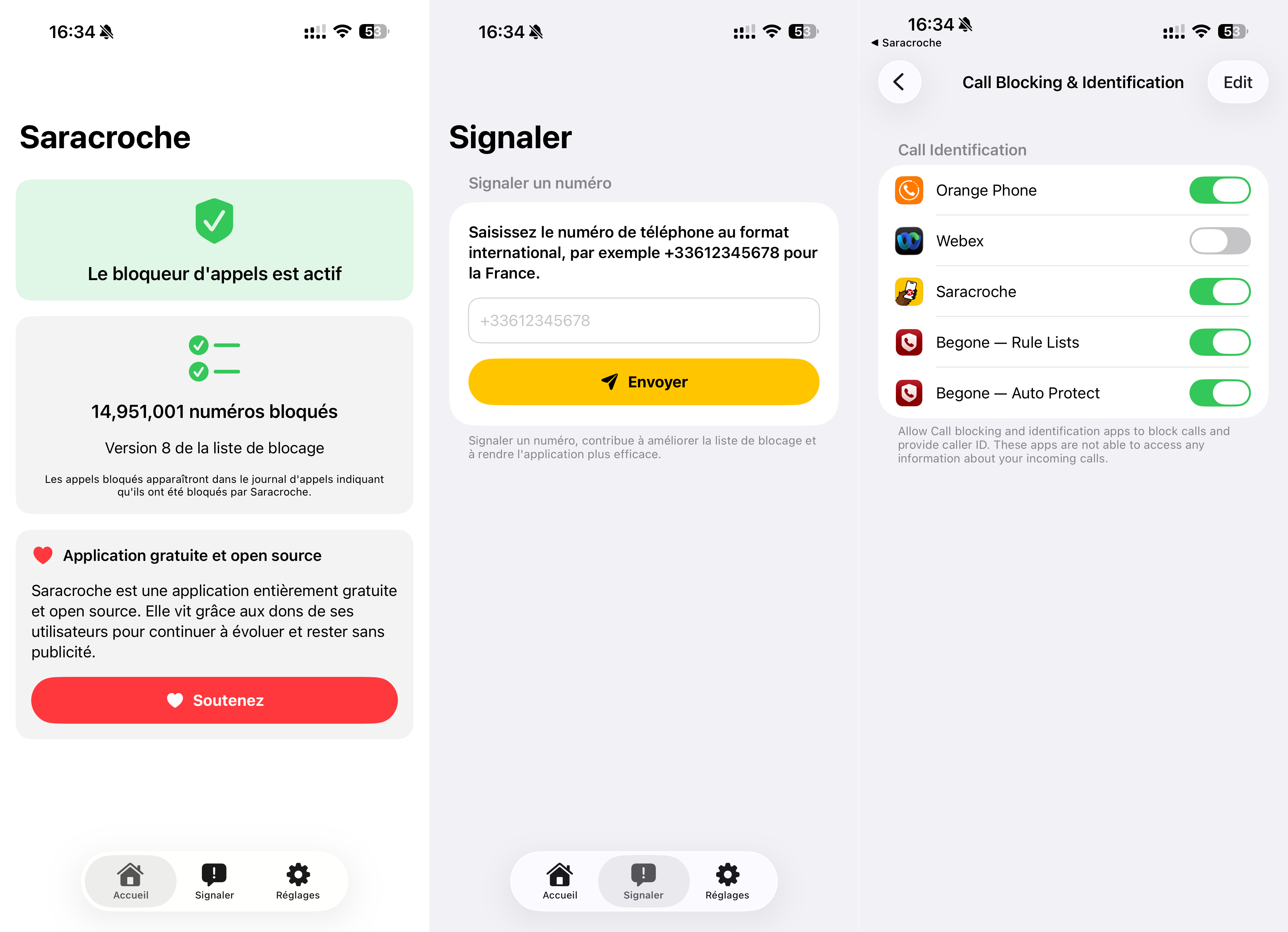 Pour ceux qui ne veulent pas payer, Saracroche est l’alternative idéale. Disponible sur iOS et Android, cette application open source repose sur une base de données communautaire avec environ 15 millions de numéros en février 2026.