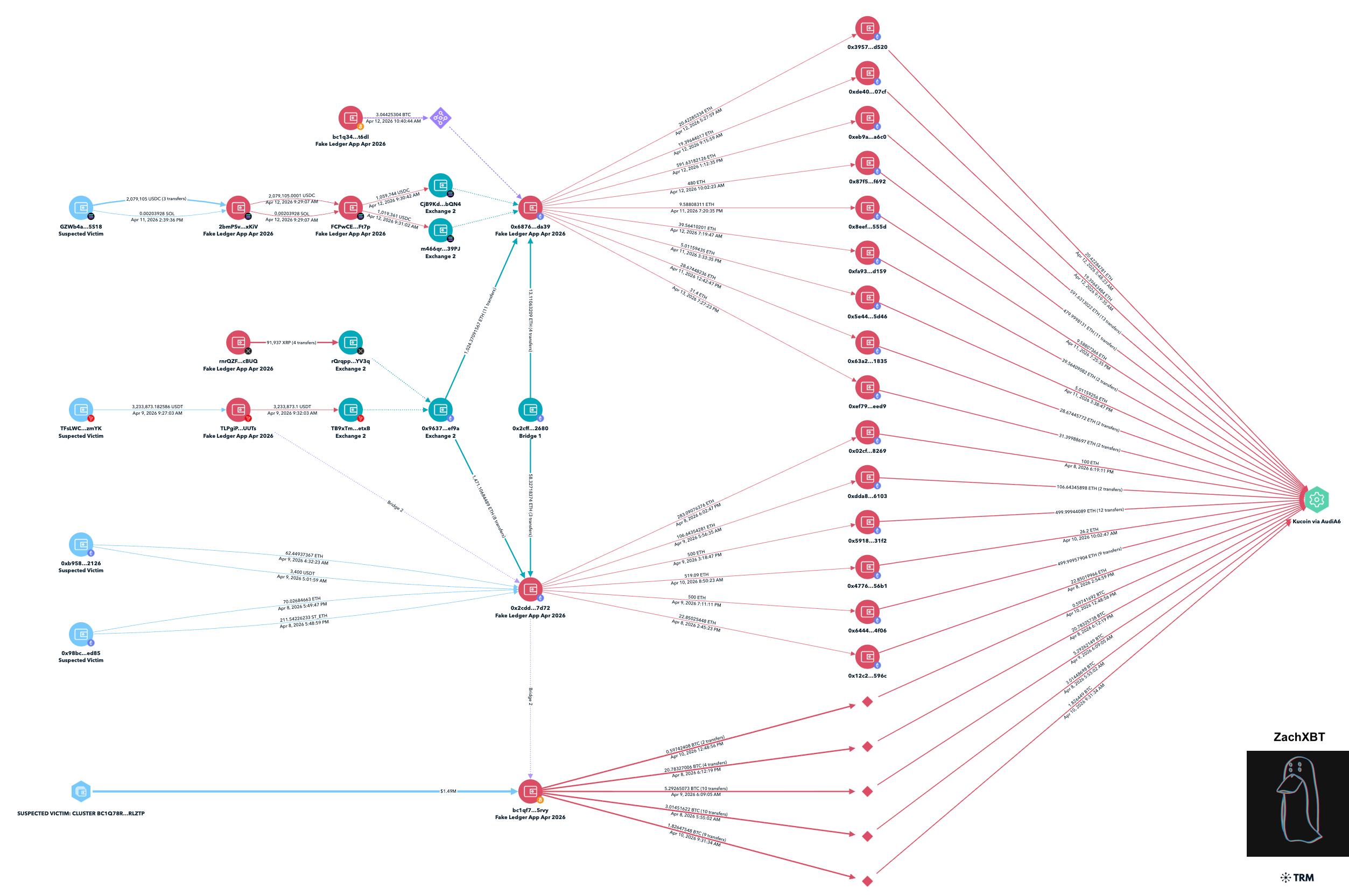 Le 14 avril, il publie son analyse complète sur Telegram et le bilan est lourd : 9,5 millions de dollars dérobés en sept jours, répartis sur cinq blockchains Bitcoin, Ethereum, Tron, Solana et XRP. Parmi les victimes, trois ont perdu des sommes à sept chiffres.