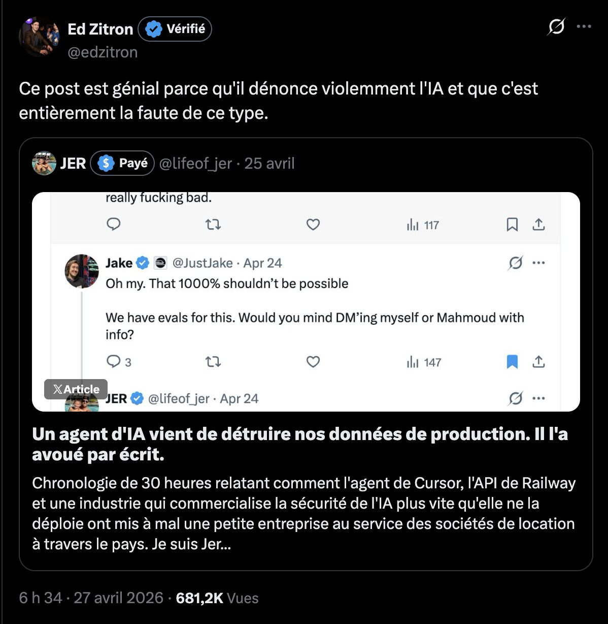 Il serait donc tentant de pointer les fournisseurs d’outils comme seuls coupables, mais les réactions sur X insistent également sur la responsabilité du CEO. Jer Crane a commis des erreurs que n’importe quel développeur expérimenté identifierait : une clé API stockée dans un fichier accessible à l’agent, aucune isolation stricte entre environnement de test et production, pas de sauvegarde externe indépendante à jour.