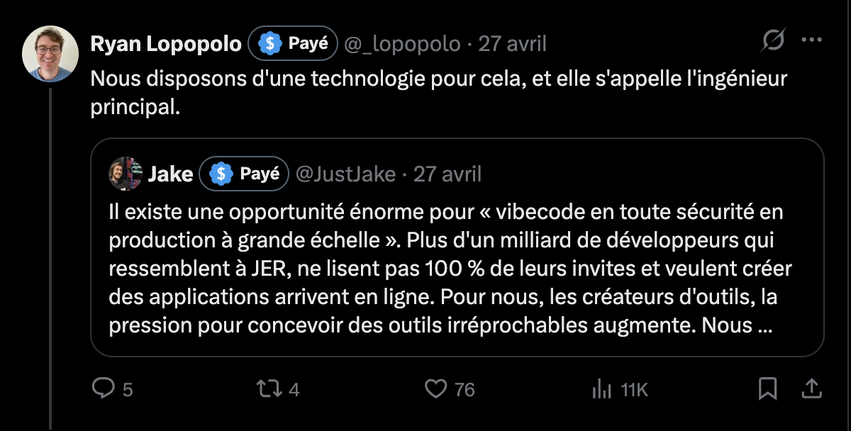 Les principaux accusés n’ont pas tardé à réagir. Dans un billet publié peu après, Jake Cooper, PDG de Railway, ne conteste pas les défaillances de sa plateforme. Il les reconnaît, promet des garde-fous, et pose un diagnostic : une nouvelle génération de « constructeurs » émerge (comprenez les vibe codeurs) qui ne lit pas entièrement la documentation, ne vérifie pas systématiquement les sorties de son IA, et ne maîtrise pas complètement les contrats d’API. Le chef d’entreprise y voit non pas un problème, mais le résultat d’« une époque passionnante ». Selon lui, il y aurait un milliard de nouveaux développeurs à connecter, et c’est aux outils de s’adapter à eux, pas l’inverse.