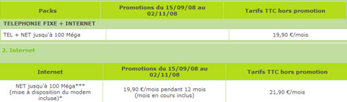 En outre, Numericable lance une offre double-play (Internet jusqu’à 100 Méga + téléphonie fixe) à 19,90 euros par mois. Mais pour le coup, nous ne savons pas si la majoration des deux euros s’applique également. En effet, alors que notre confrère PC Inpact affirme que oui, le site de Numericable est beaucoup moins clair sur le sujet. Car si la section « packs » du tableau récapitulatif des offres fait bien apparaître une offre Internet + Téléphone à 19,90 € sans aucune majoration apparente, une offre Internet seule apparaît également dans la section « Internet », au même tarif pratiqué pendant 12 mois, dans le cadre d’une promotion du 15 septembre au 2 novembre. Au delà des douze mois ou en dehors de de la période promotionnelle, le tarif passe à 21,90 € par mois. Dans les deux cas, il s’agit d’offres réservées aux nouveaux clients résidentiels pour un engagement minimal d’un an.