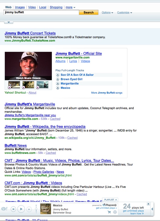 Le moteur de recherche propose en effet désormais d’écouter un morceau de musique en intégralité et gratuitement directement dans les résultats de recherche sur Yahoo, avec un lecteur Foxytunes intégré en bas de page. Pour ce faire, Yahoo s’est lié au service Rhapsody de Real Networks, qui propose un catalogue de 5 millions de chansons. La gratuité du service est toutefois limitée à 25 morceaux par mois. Au delà, il faut s’abonner à Rhapsody Unlimited pour 12,99 $ par mois, ou se contenter d’extraits de 30 secondes.