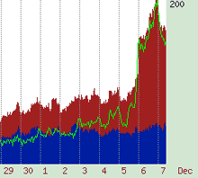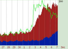 La vie rêvée des anges, le film de Erick Zonca avec Elodie Bouchez et Natacha Régnier était diffusé hier lundi 6 décembre sur Arte. L’effet de cette parution sur la distribution du fichier via eDonkey est on ne peut évident. Les demandes de téléchargement du film, symbolisées ci-dessous en vert, ont plus que triplé dans la soirée.