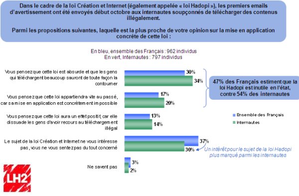 Le sondage, mené par téléphone le 29 et 30 octobre auprès de 962 individus âgés de 18 ans et plus, révèle que 47 % des sondés considèrent que la loi Hadopi est un coup d’épée dans l’eau. 30 % des Français jugent que la loi « est absurde » parce que « les gens qui téléchargent beaucoup sauront de toute façon la contourner« . 17 % % des Français estiment en revanche que la loi est obsolète, parce que « sa mise en application est concrètement impossible« .
